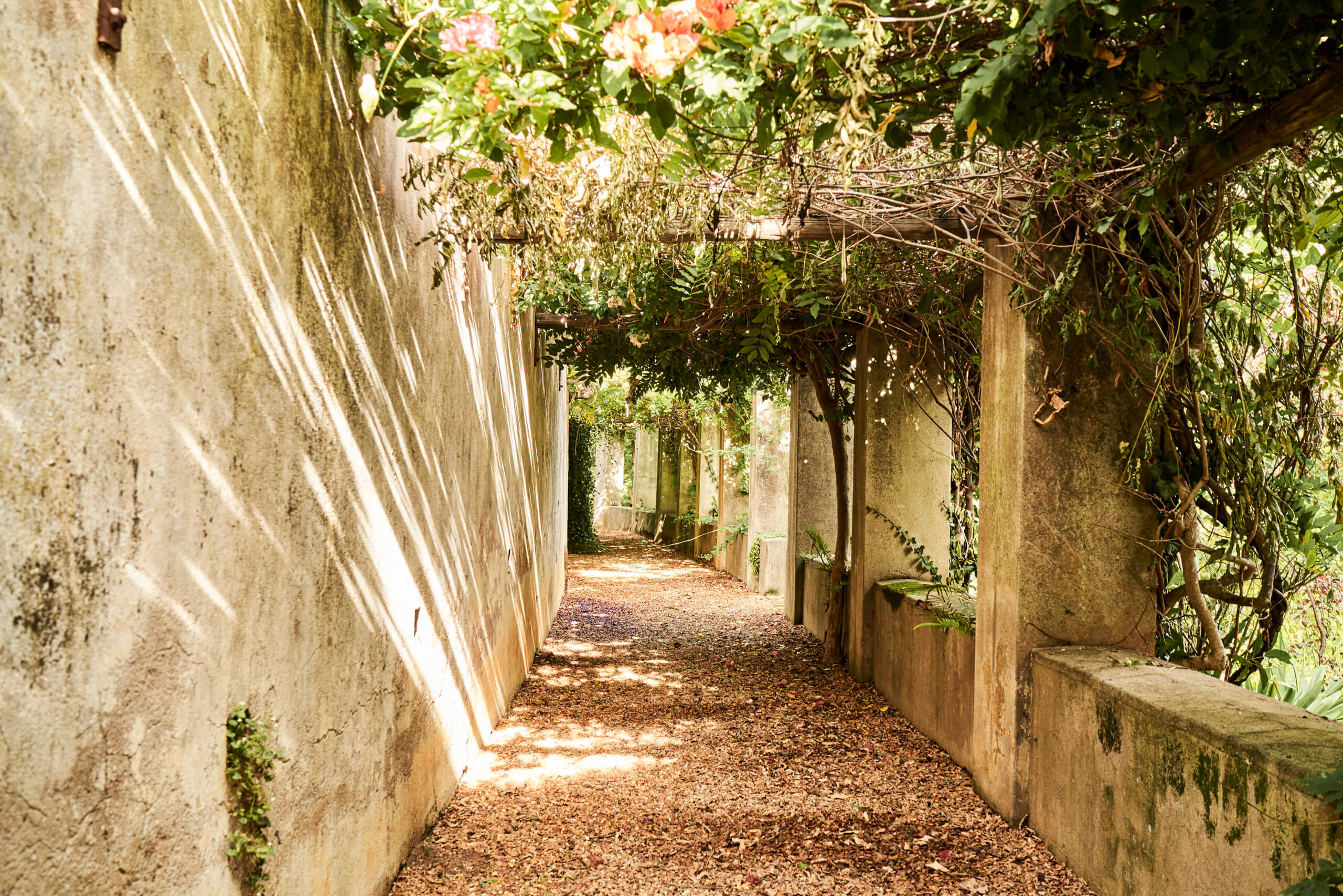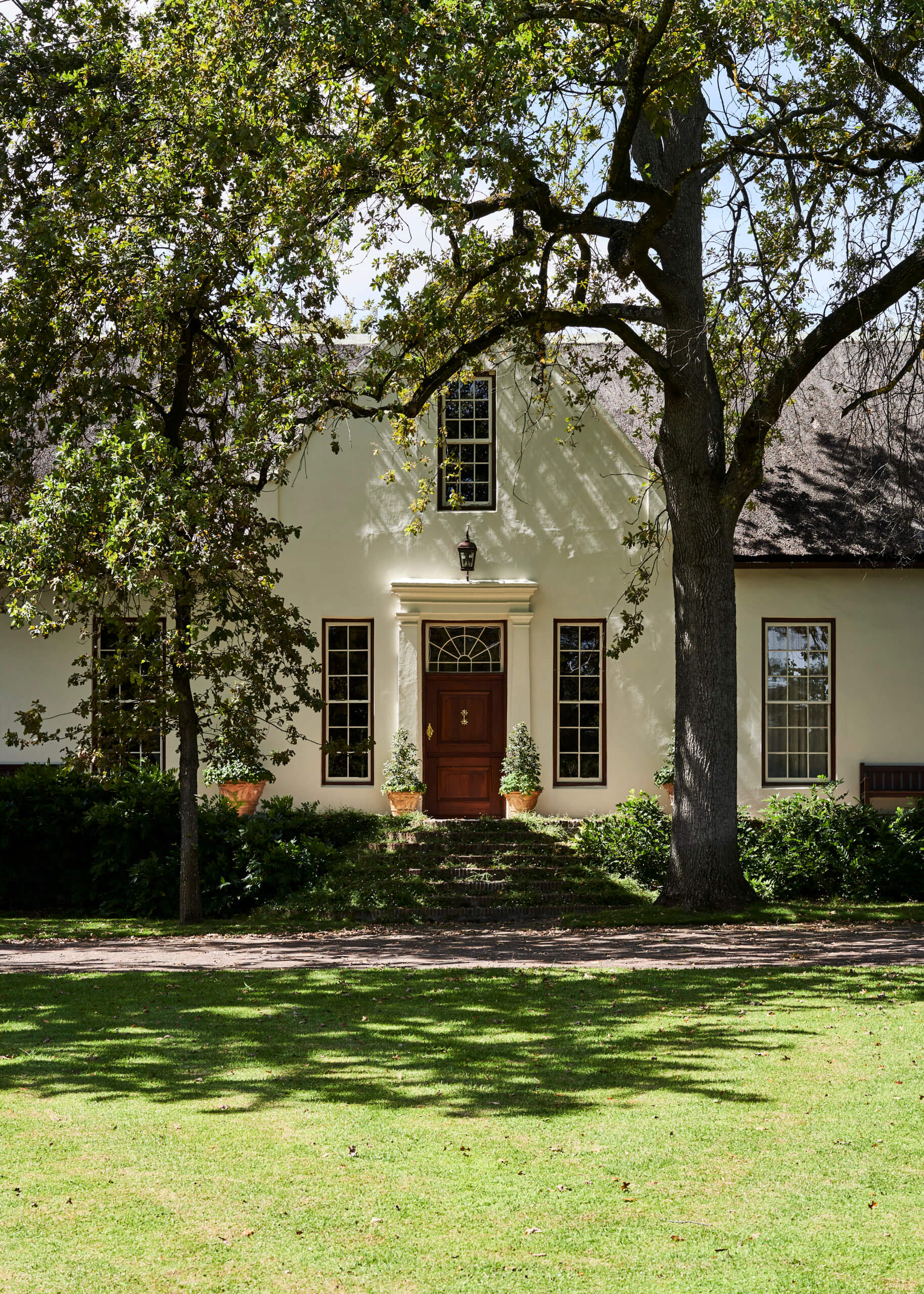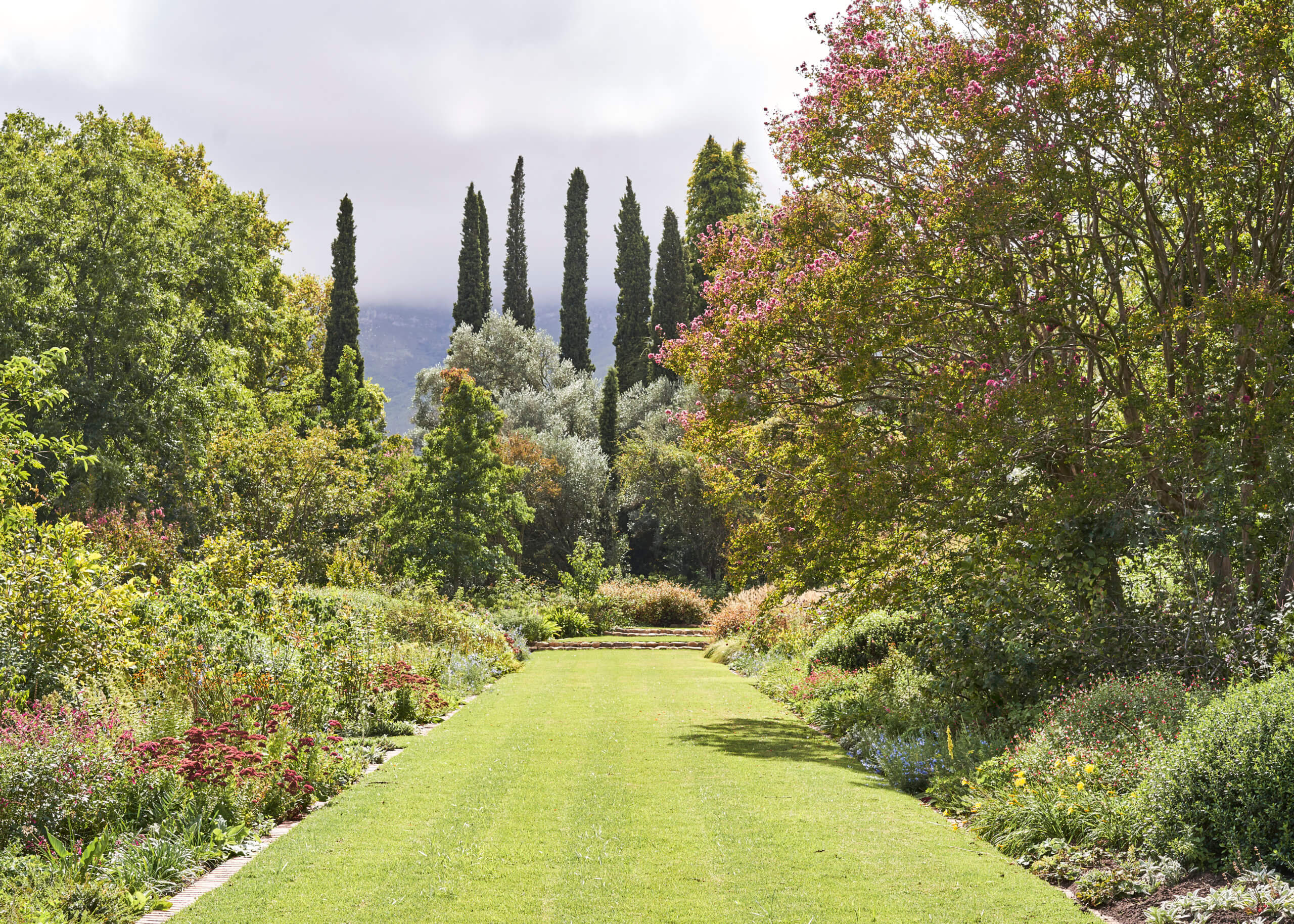 Special features are the 200 year old pergola running the length of the garden and a Chartre style labyrinth set amongst the flower borders. The borders are filled with roses, foxgloves and many interesting perennials. It also features a wonderful pond and is divided using hedges and paths. The Simonsberg Mountain and the fields beyond provide the borrowed landscape.